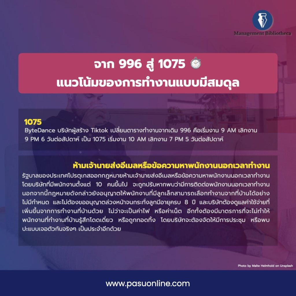 จากเดิมพนักงานชาวจีนมีชั่วโมงทำงานวันละ 12 ชั่วโมง สัปดาห์ละ 6 วัน (996) ไปสู่วันละ 9 ชั่วโมงสัปดาห์ละ 5 วัน (1075) และไม่ใช่ที่จีนที่เดียว ประเทศอื่นๆ เช่น โปรตุเกสก็ได้ออกกฎหมายที่ห้ามเจ้านายติดต่อลูกน้องในบริษัทนอกเวลาทำงานมาแล้ว แสดงให้ถึงแนวโน้มของการให้คนทำงานมีความสมดุลระหว่างงานและชีวิตส่วนตัวมากขึ้น