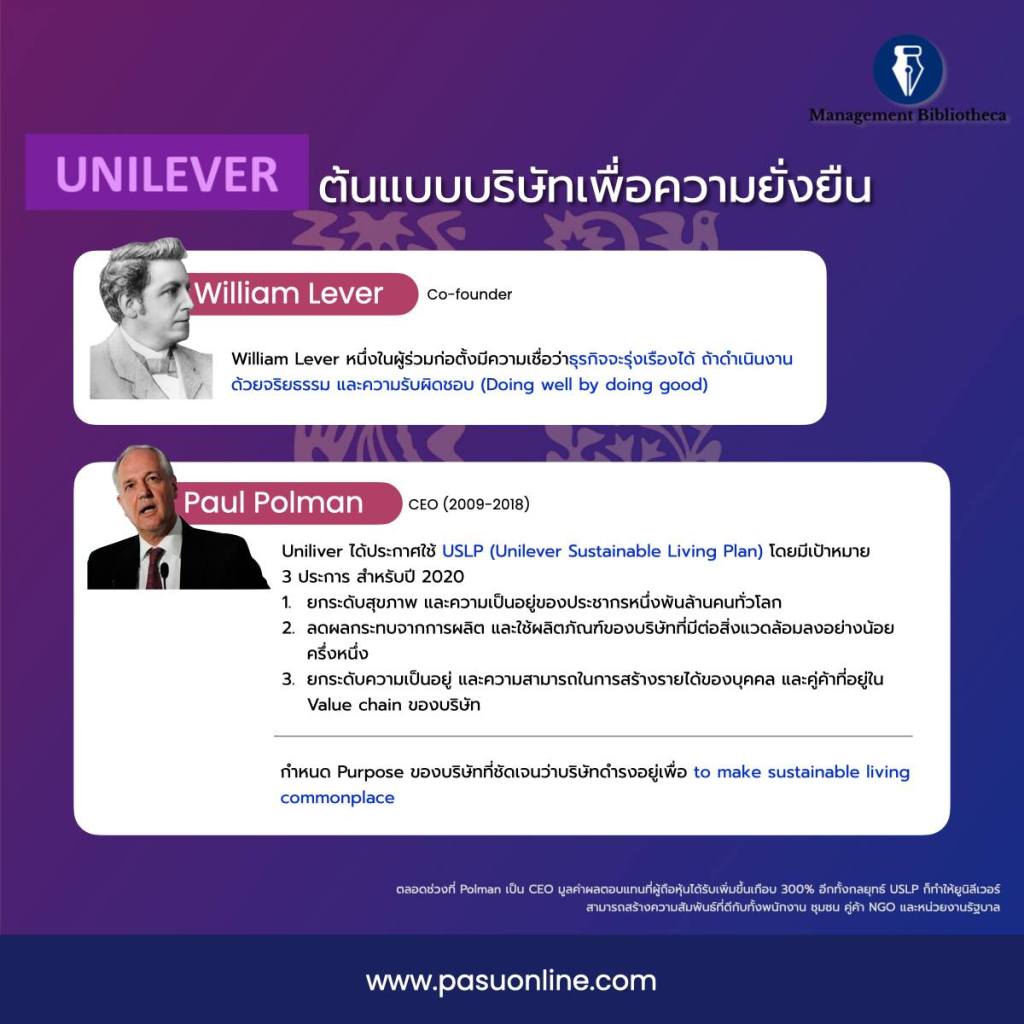 เคยสอบถามผู้เชี่ยวชาญต่างประเทศว่า ถ้าให้แนะนำบริษัทชั้นนำระดับโลกที่ทำและประสบความสำเร็จในเรื่องของความยั่งยืนอย่างจริงจัง จะแนะนำบริษัทใด คำตอบที่ได้รับคือ “ยูนิลีเวอร์”