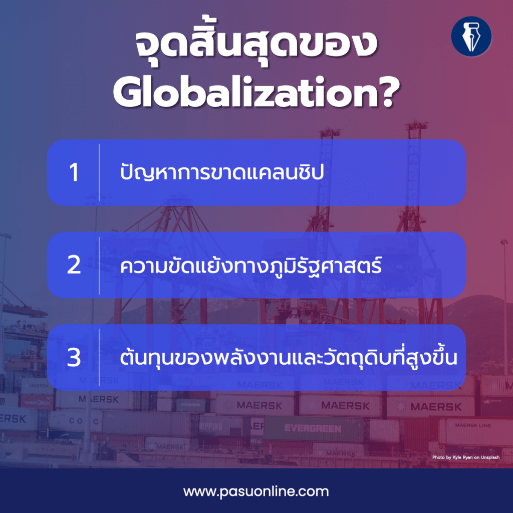 สาเหตุที่ทำให้มองว่า Globalization ถึงคราวสะดุดนั้น ก็เนื่องจากการเปลี่ยนแปลงที่สำคัญของโลกในช่วง 1-2 ปีที่ผ่านมา ทั้งโควิด19 การขาดแคลนชิปที่เป็นวัตถุดิบสำคัญของอุปกรณ์เทคโนโลยีใหม่ๆ และเรื่องระหว่างรัสเซียและยูเครน ซึ่งส่งผลทำให้การผลิตและขนส่งวัตถุดิบต่างๆ เกิดการชะงักงัน