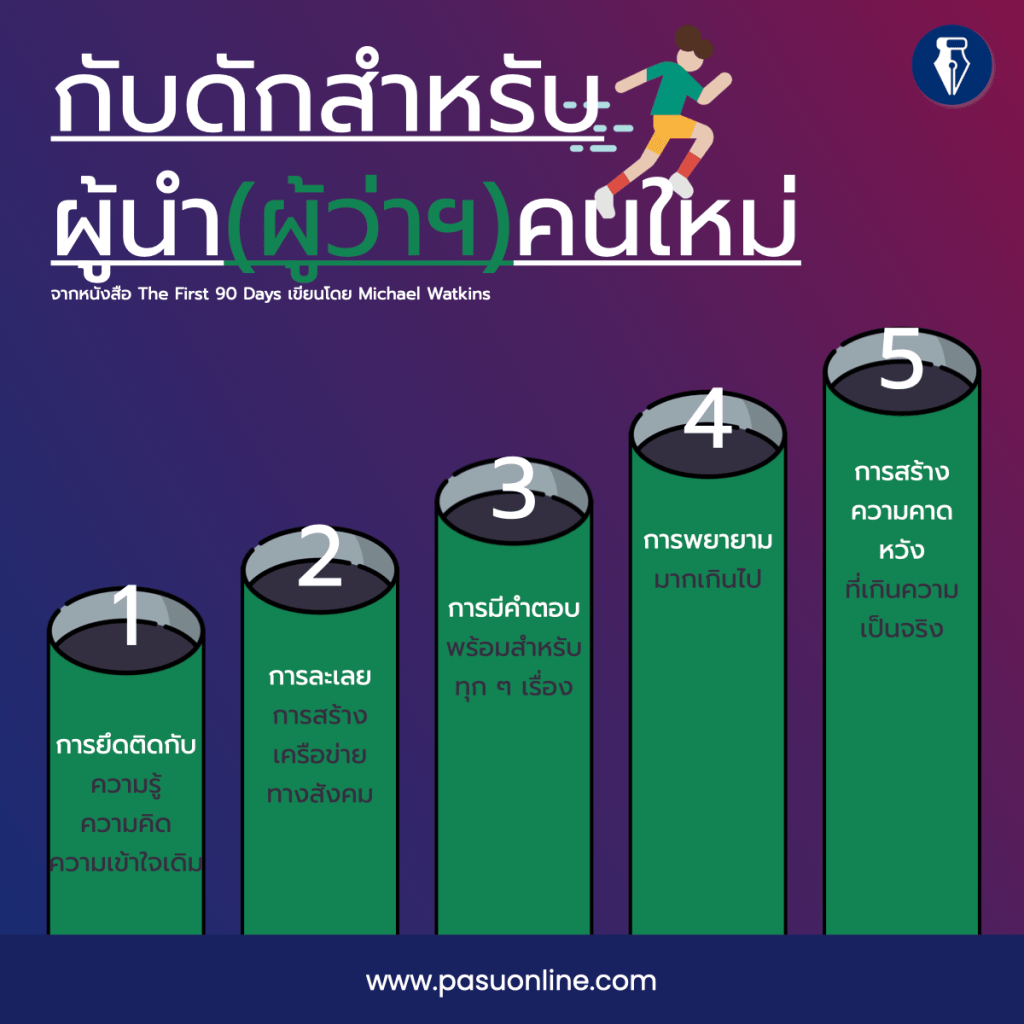 กับดักข้างต้นเป็นเพียงแค่ส่วนหนึ่งของหลายคำแนะนำ จากหนังสือ The First 90 Days ครับ สนใจลองหาอ่านดูได้ และขอให้ผู้นำใหม่ผ่านพ้นช่วง 90 วันแรกด้วยดี.