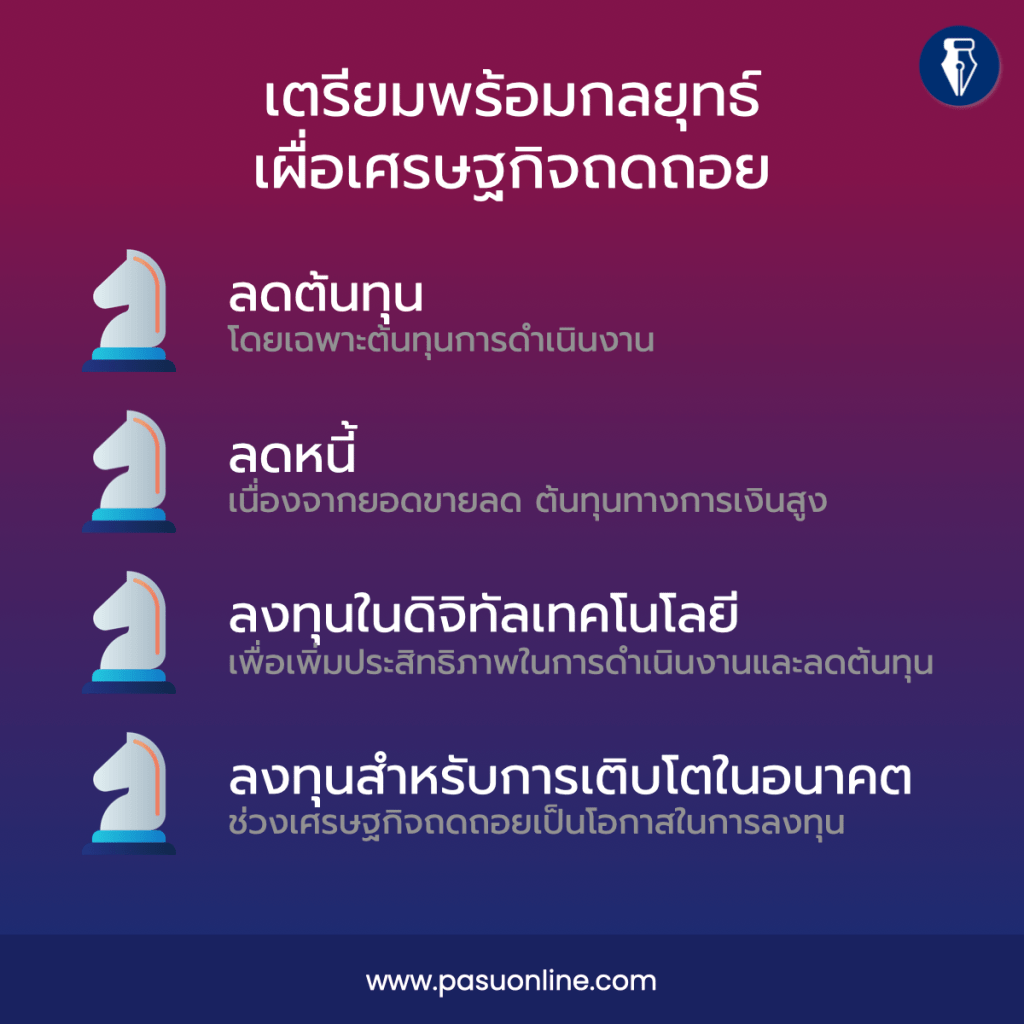 สรุป กลยุทธ์ที่เหมาะสมสำหรับช่วงเศรษฐกิจถดถอยคือ กลยุทธ์ที่มีความสมดุล ทั้งระหว่างการลดต้นทุน การลดหนี้ กับการลงทุนในเทคโนโลยีและลงทุนสำหรับอนาคต แต่สำคัญที่สุดคือต้องอย่าลืมที่จะเตรียมพร้อมไว้ล่วงหน้าเลย ไม่ใช่รอให้เกิดภาวะถดถอยแล้วค่อยมาคิด
