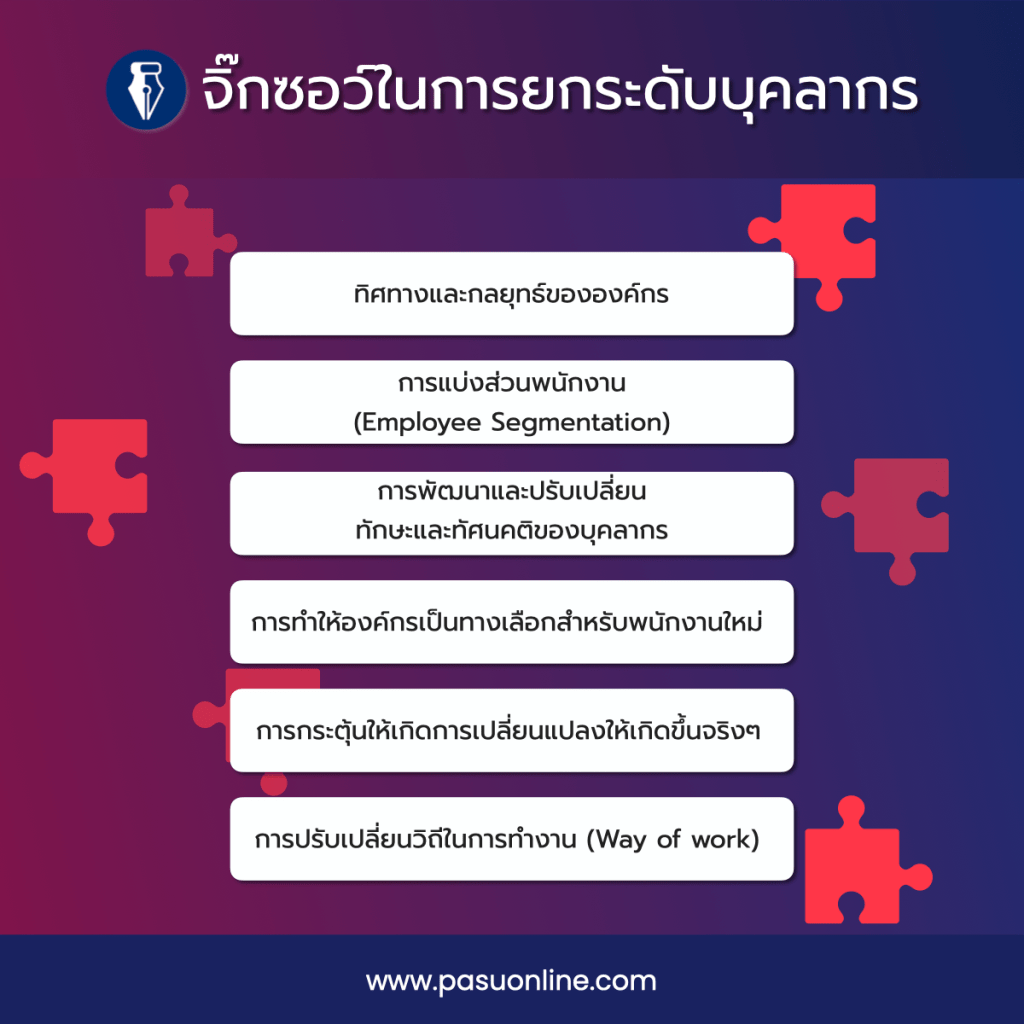 การ Transform องค์กรให้สำเร็จนั้นจะต้องประกอบด้วยองค์ประกอบหลายๆ ส่วนที่เข้ามาประกอบกันเหมือนตัวต่อจิ๊กซอว์ ที่เมื่อประกอบกันแล้ว จะนำไปสู่การยกระดับในเรื่องคนได้จริง