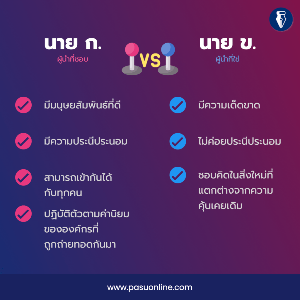 ไม่แปลกใจว่าถ้ามีโอกาสเลือกได้ พนักงานก็อยากจะได้ นาย ก. มาเป็นหัวหน้า เพราะสามารถเข้ากับทุกคนได้ มีความสบายใจในการทำงานร่วมด้วย อีกทั้งรูปแบบการทำงานก็เป็นไปในรูปแบบเดิมๆ ที่คุ้นเคย