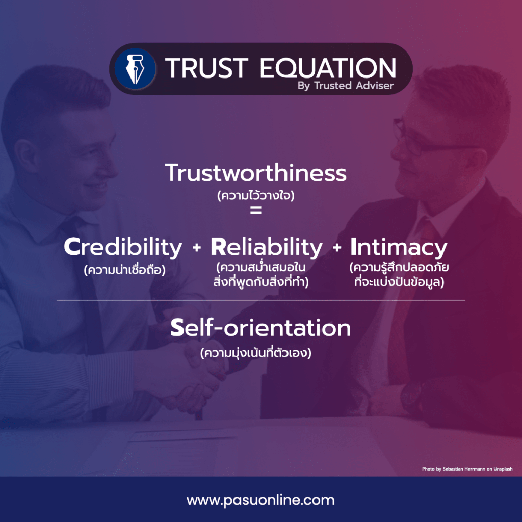 ในสมการนั้น T (Trustworthiness) เท่ากับผลรวมของ C (Credibility) หรือความน่าเชื่อถือ บวกกับ R (Reliability) หรือความสม่ำในพฤติกรรมและความสัมพันธ์ระหว่างสิ่งที่พูดกับสิ่งที่แสดงออก บวกกับ I (Intimacy) หรือความรู้สึกปลอดภัยที่จะแบ่งปันข้อมูล