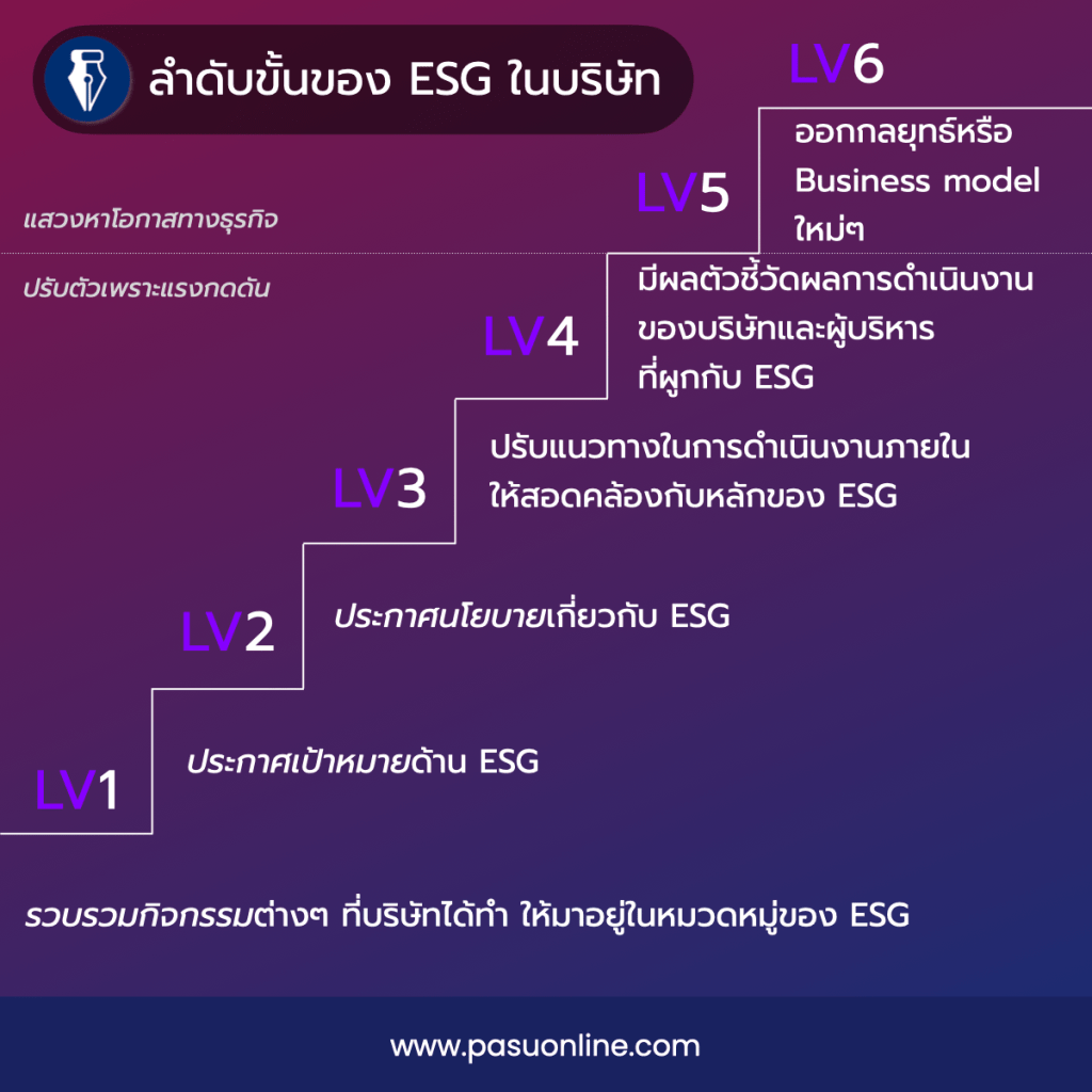 บางบริษัทอาจจะปรับแนวทางการดำเนินงาน บางบริษัทผูกผลตอบแทนของผู้บริหารเข้ากับเป้าทาง ESG ขณะที่บางบริษัทก็ไปถึงขั้นของการหาโอกาสทางธุรกิจจาก ESG ซึ่งทั้งหมดนี้ก็ขึ้นอยู่กับแต่ละบริษัทว่าจะก้าวไปสู่ขั้นไหน เมื่อไร และอย่างไร