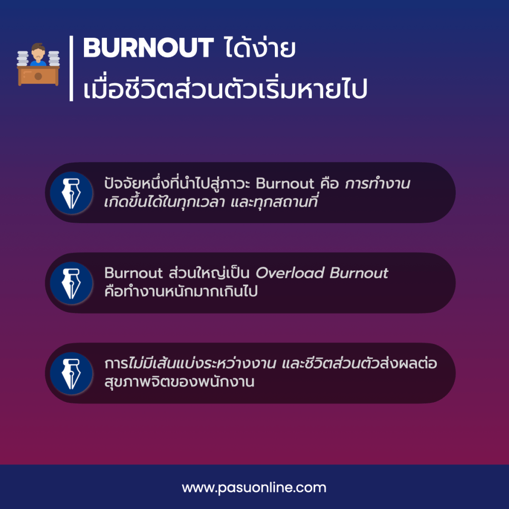ปัจจัยหนึ่งที่นำไปสู่ภาวะ Burnout คือ เมื่อการทำงาน ได้ก้าวข้ามเส้นแบ่งระหว่างงานและชีวิตส่วนตัว พนักงานมีความรู้สึกว่าชีวิตส่วนตัวได้หายไปกับงาน การทำงานเกิดขึ้นในทุกเวลา ทุกสถานที่ การแบ่งแยกอย่างชัดเจนในอดีต ทั้งในด้านของสถานที่และเวลา ระหว่างการทำงานและชีวิตส่วนตัวได้จางหายไป