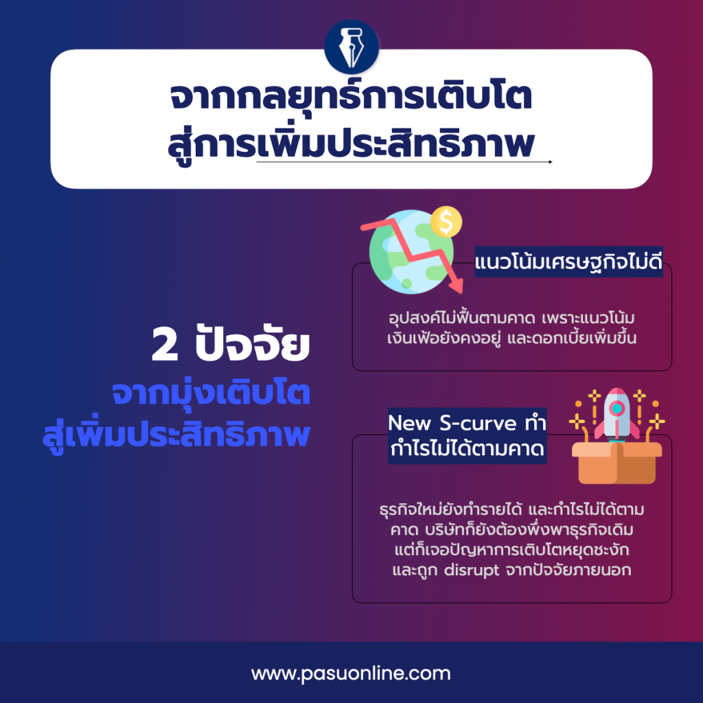 ดังนั้น ทางออกในการยังคงรักษากำไรของธุรกิจ เพื่อรอให้ธุรกิจใหม่ได้เติบโต ก็จำเป็นต้องเน้นการเพิ่มประสิทธิภาพและผลิตภาพจากธุรกิจเดิม