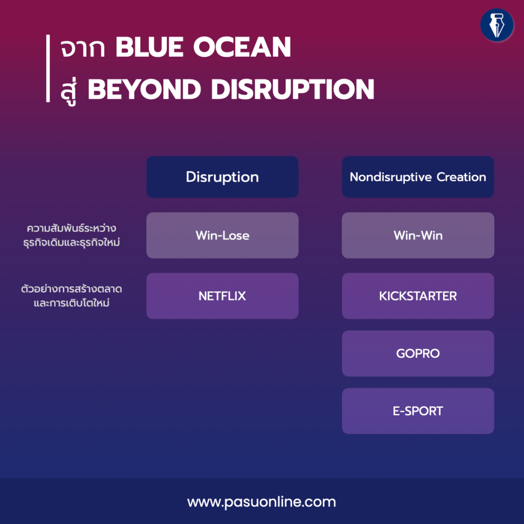 Nondisruptive Creation จะเป็นการเติบโตและสร้างตลาดใหม่ โดยไม่ทำลายหรือส่งผลในเชิงลบต่อธุรกิจเดิมเหมือนกับการถูกดิสรัป