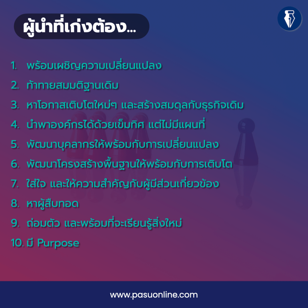 10.เป็นผู้นำที่มี Purpose หรือสาเหตุ (Why) ในการเป็นผู้นำที่ชัดเจน โดยเฉพาะอย่างยิ่งเป็นผู้นำเพื่อบริษัท ส่วนรวม หรือเพื่อคนอื่น ไม่ใช่ขึ้นมาเป็นผู้นำเพื่อส่วนตัว อีกทั้งสามารถ Walk the Talk ตาม Purpose ทั้งของตนเอง และของบริษัท