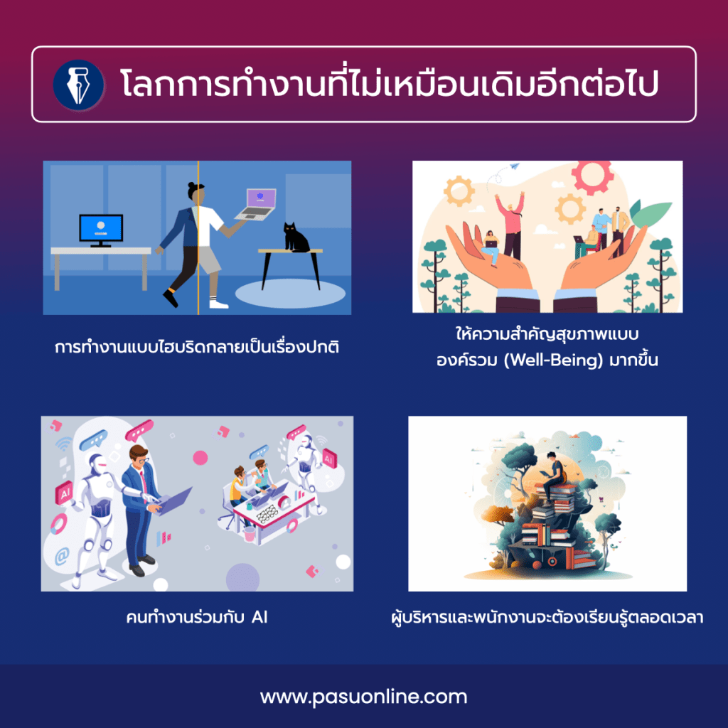 โลกการทำงานในอนาคตจะเปลี่ยนไปจากเดิมแน่ และเปลี่ยนแปลงเร็วขึ้นกว่าที่คาดไว้ ดังนั้นทั้งผู้บริหารและพนักงานเองก็ต้องเตรียมใจและทักษะให้พร้อมที่จะรองรับต่อการเปลี่ยนแปลงที่เกิดขึ้น