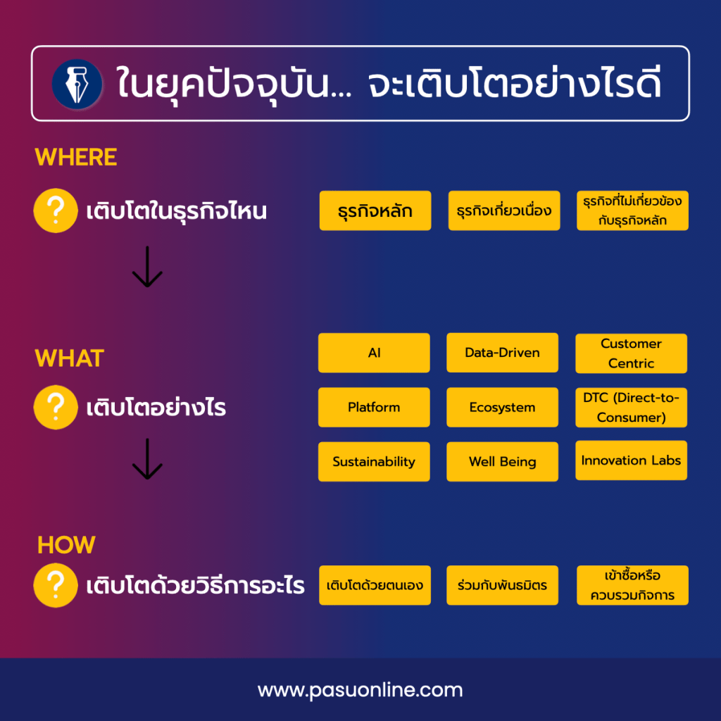 ในภาวะที่เศรษฐกิจไทยยังมีความอึมครึม ขณะที่เศรษฐกิจโลกก็มีแต่ความไม่แน่นอนและสามารถพลิกผันได้ตลอด คำถามหนึ่งที่อยู่ในใจผู้บริหารและเจ้าของธุรกิจทั้งหลายคือ…แล้วจะเติบโตต่อไปอย่างไรดี?
