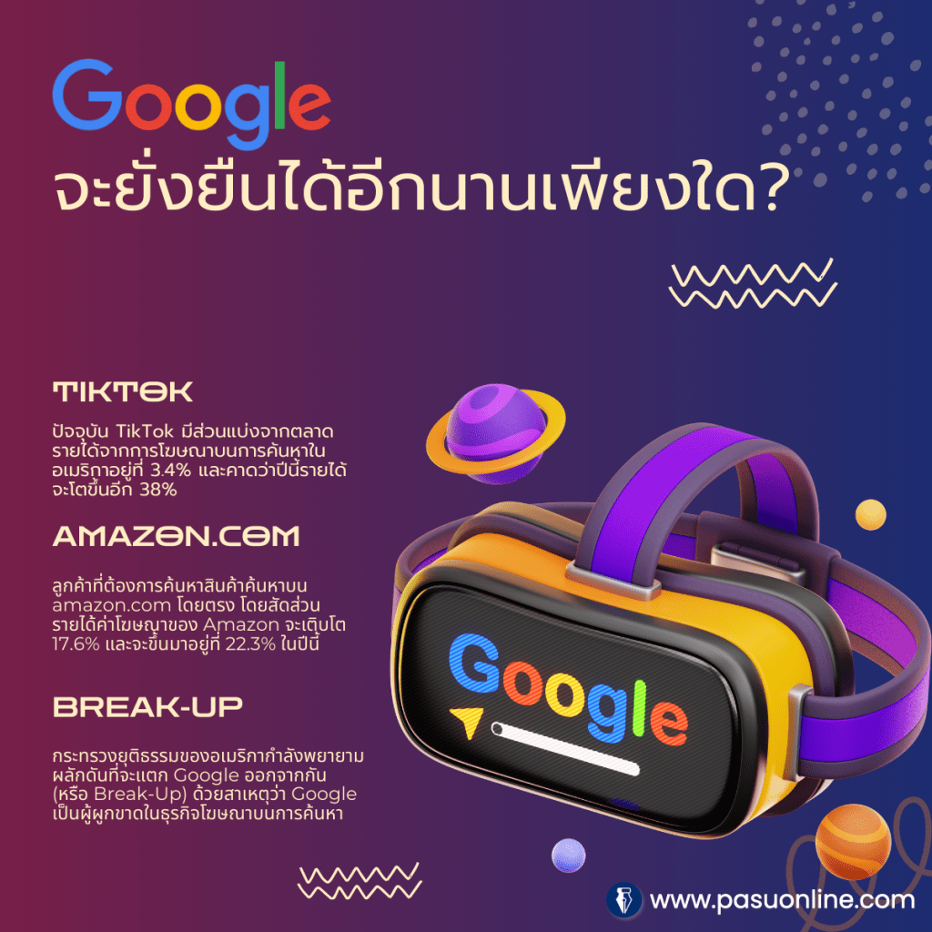 ปัจจุบันธุรกิจการค้นหาและรายได้จากการโฆษณาของ Google กำลังเผชิญกับความท้าทาย ทั้งพฤติกรรมของลูกค้าที่เปลี่ยนไป การเข้ามาของคู่แข่งขันรายใหม่ และผลกระทบทางด้านกฎหมาย