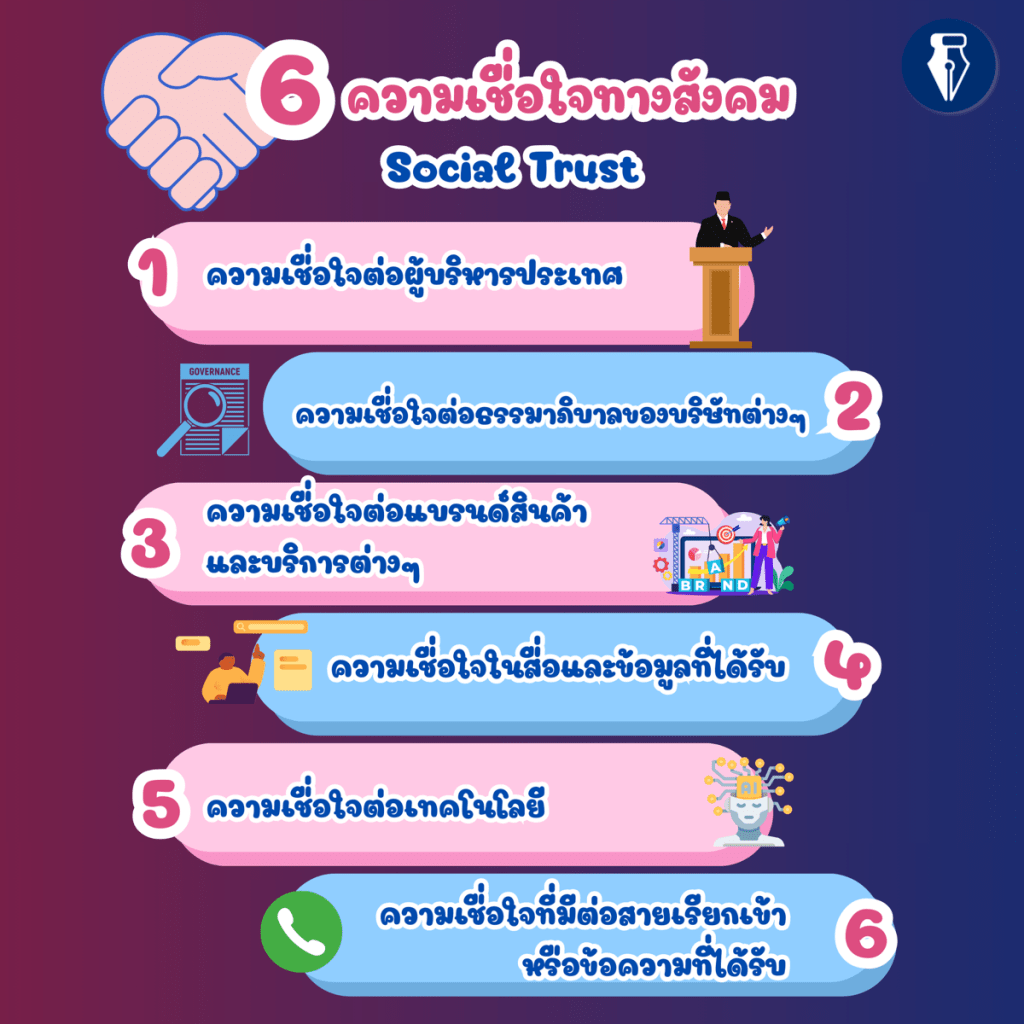 ความเชื่อใจที่จะเป็นประเด็นสำหรับปีใหม่นี้ เป็นเรื่องของความเชื่อใจทางสังคมหรือ Social Trust ที่คนหมู่มากในสังคมจะมีความเชื่อใจต่อองค์กรหรือบุคคลต่างๆ โดยมีประเด็นที่น่าจับตามองอยู่ 6 เรื่อง