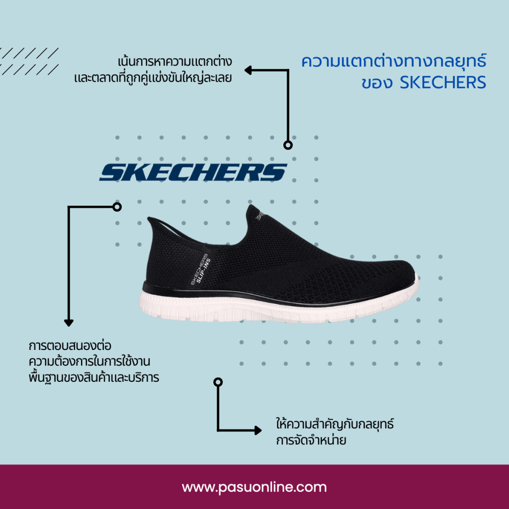 Skechers เน้นในเรื่องของการสวมใส่ที่สะดวกสบาย นุ่มเท้า และราคาที่เข้าถึง ขณะที่เจ้าตลาดอย่าง Nike หรือ Adidas จะเน้นการมีดาราหรือนักกีฬาดังระดับโลกมาเป็นพรีเซนเตอร์ การมีรุ่นที่หายาก และราคาที่สูง ขณะที่แบรนด์อื่นจะเน้นสมรรถนะ เทคโนโลยี และการออกแบบ