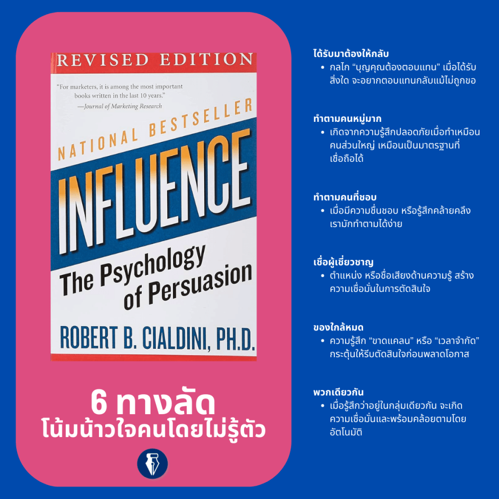 แนวคิดข้างต้นเป็นส่วนหนึ่งมาจากหนังสือขายดีอมตะเล่มหนึ่งชื่อ Influence: The Psychology of Persuasion เขียนโดย Robert B. Cialdini ที่ตีพิมพ์ครั้งแรกไปเมื่อปี 1984 และเพิ่งฉลองครบรอบ 40 ปีไปเมื่อปีที่แล้ว และยังคงเป็นหนังสือติดอันดับขายดีทั่วโลก ถึงแม้โลกในปัจจุบันจะแตกต่างไปอย่างมากจากเมื่อ 40 ปีที่แล้ว แต่แนวคิดจากหนังสือเล่มดังกล่าวก็ยังใช้ได้ดีอยู่ เนื่องจากพื้นฐานทางจิตวิทยาของมนุษย์ไม่ได้เปลี่ยนไปมาก เพียงแต่วิธีการ ช่องทาง รูปแบบที่แตกต่างกันออกไป เช่นในอดีตเมื่อเห็นป้าย Sales ต้องรีบเข้าไปหา แต่ปัจจุบัน เมื่อพบว่ามีของเหลือจำนวนจำกัด ก็ต้องกดใส่ตะกร้าก่อน เป็นต้น