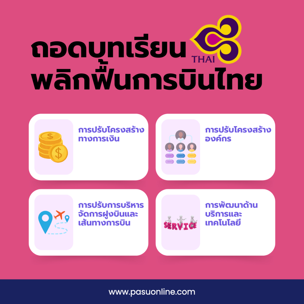 บทเรียนของการบินไทยสะท้อนให้เห็นถึงความกล้าหาญในการเปลี่ยนแปลง วิกฤตเปิดโอกาสให้เกิดการรื้อระบบเก่าและสร้างระบบใหม่ที่เน้นความคล่องตัว ประสิทธิภาพ และความยั่งยืนในระยะยาว เป็นตัวอย่างว่า องค์กรสามารถฟื้นตัวจากจุดตกต่ำที่สุดได้ หากมีการตัดสินใจที่เด็ดขาด ผู้นำที่เชื่อมั่นในเป้าหมาย และความร่วมมือที่แท้จริงจากผู้ที่เกี่ยวข้องทุกภาคส่วน
