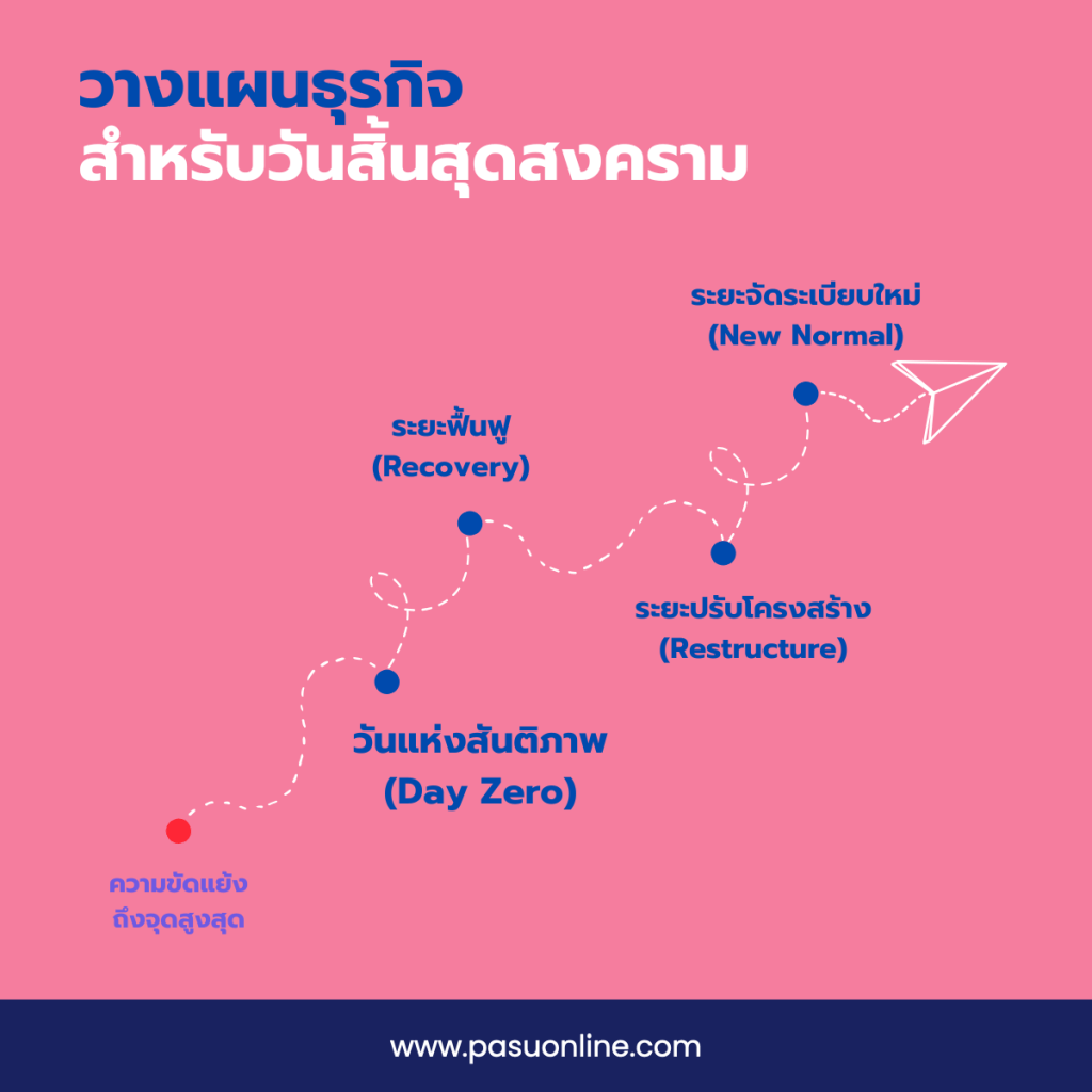 จะเห็นได้ว่าจากทั้ง 4 ระยะข้างต้น ระยะที่สำคัญที่สุดคือระยะที่ 1 ที่อาจจะเกิดขึ้นอย่างกระทันหัน และจะมีความวุ่นวายเกิดขึ้น ซึ่งผู้บริหารจะต้องให้ความสำคัญ เริ่มเตรียมพร้อมและเริ่มคิดได้แล้วว่าในระยะที่ 1 นั้น ถ้าเกิดขึ้นจริงบริษัทจะต้องทำอะไรบ้าง คำถามที่ผู้บริหารทุกท่านควรถามตัวเองในวันนี้ไม่ใช่ สงครามจะสิ้นสุดเมื่อไร? แต่คือ เมื่อวันนั้นมาถึงเราพร้อมแค่ไหน? การวางแผนสำหรับโลกหลังสงครามไม่ใช่การมองโลกในแง่ดีโดยไม่สนใจความเป็นจริง แต่คือการยอมรับว่าวิกฤตทุกครั้งมีจุดสิ้นสุด และผู้ที่ชนะในโลกหลังวิกฤตคือผู้ที่เตรียมพร้อมไว้ล่วงหน้า