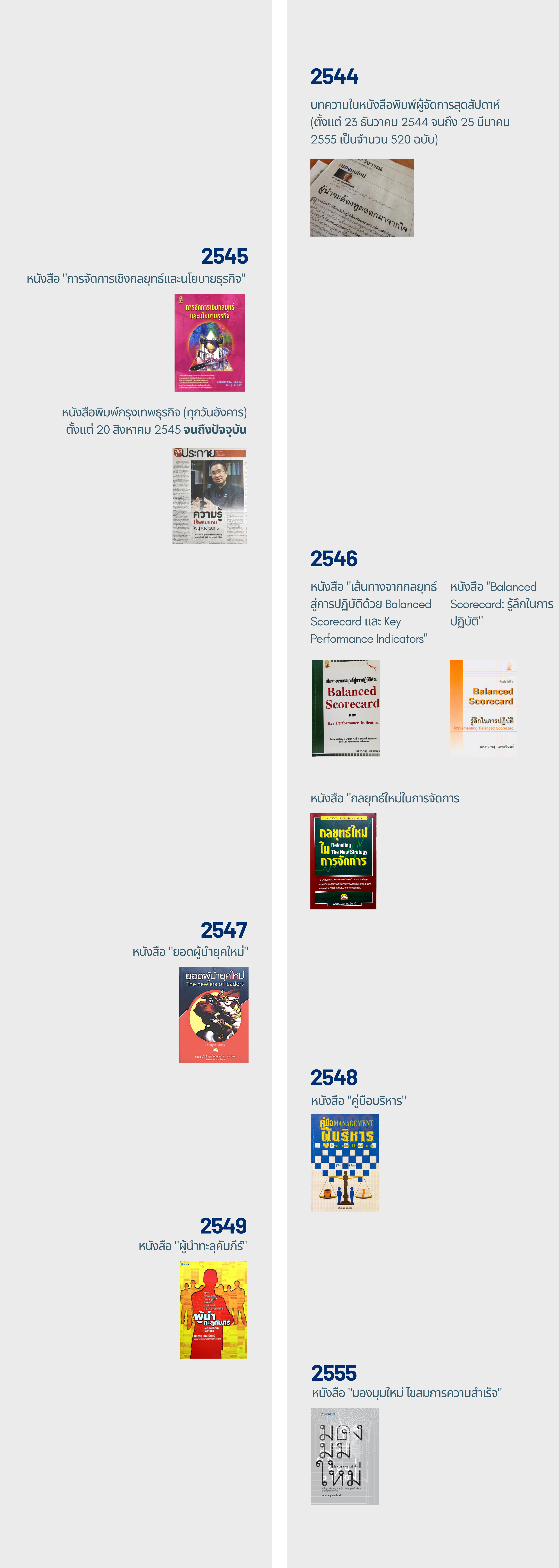 ในปี 2001 ผมได้รับโอกาสให้เริ่มเขียนบทความเป็นประจำในหนังสือพิมพ์ผู้จัดการรายสัปดาห์ และเขียนเรื่อยมาทุกสัปดาห์จนกระทั่งทางหนังสือพิมพ์ผู้จัดการรายสัปดาห์ปรับเปลี่ยนรูปแบบไปอยู่บนเว็บในปี 2012 ก็รวบรวมได้ 519 บทความ
